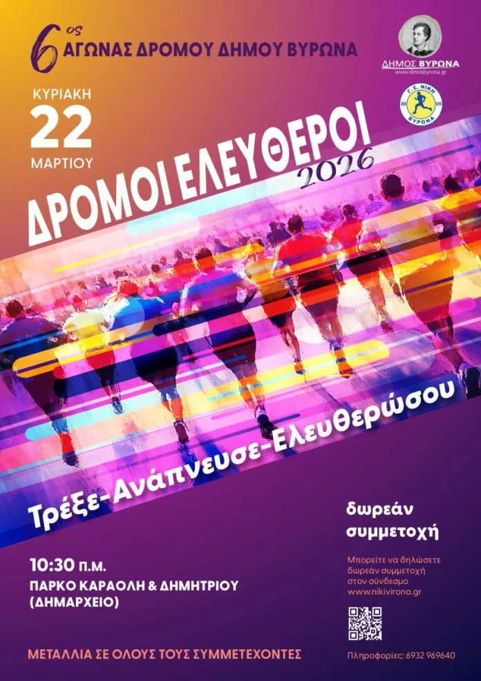 Ο Δήμος Βύρωνα, σε συνεργασία με τον Γυμναστικό Σύλλογο «Νίκη Βύρωνα», διοργανώνει την Κυριακή 22 Μαρτίου 2026 τον 6ο Αγώνα Δρόμου «Δρόμοι Ελεύθεροι», μια μεγάλη αθλητική γιορτή που απευθύνεται σε πολίτες κάθε ηλικίας.