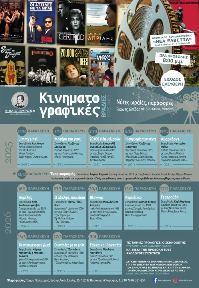 Με τη συνέχιση του κύκλου προβολών «Νότες ωραίες, παράφορες – Εικόνες ελπίδας σε δίσεκτους καιρούς» συνεχίζονται οι Κινηματογραφικές Βραδιές του Δήμου Βύρωνα για την περίοδο 2025-2026. Η επόμενη προβολή θα πραγματοποιηθεί την Παρασκευή 13 Μαρτίου 2026 στις 20:00 στον Δημοτικό κινηματογράφο «Νέα Ελβετία».