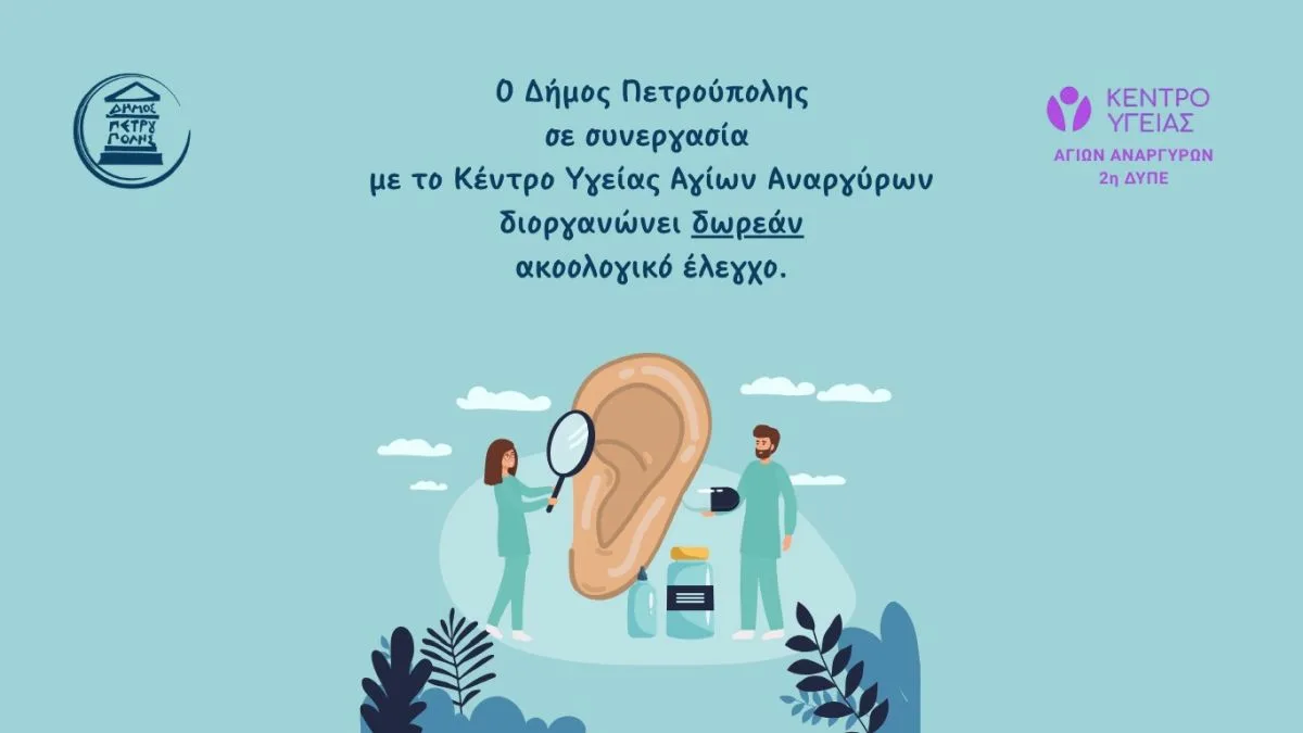 Ο Δήμος Πετρούπολης, σε συνεργασία με το Κέντρο Υγείας Αγίων Αναργύρων, προσφέρει τη δυνατότητα δωρεάν ακοολογικού ελέγχου στα μέλη των ΚΑΠΗ αλλά και σε κάθε δημότη, κατόπιν ραντεβού. Οι εξετάσεις θα πραγματοποιηθούν σε τρία Κέντρα Ανοιχτής Προστασίας Ηλικιωμένων, σε συγκεκριμένες ημερομηνίες και ώρες.