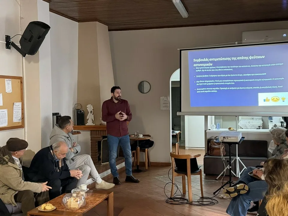 Ιδιαίτερα αναλυτική ήταν η παρουσίαση του υποδιοικητή του Τμήματος Ασφάλειας Κηφισιάς, Λάζαρος Μουρατίδης, ο οποίος ανέπτυξε τις συνηθέστερες μεθόδους εξαπάτησης μέσω τηλεφώνου, διαδικτύου ή ακόμη και κατ’ οίκον επισκέψεων. Έδωσε έμφαση στην ανάγκη αποφυγής παροχής προσωπικών δεδομένων και οικονομικών στοιχείων, επισημαίνοντας ότι η ενημέρωση και η επαγρύπνηση αποτελούν την πρώτη γραμμή άμυνας απέναντι στις απάτες.