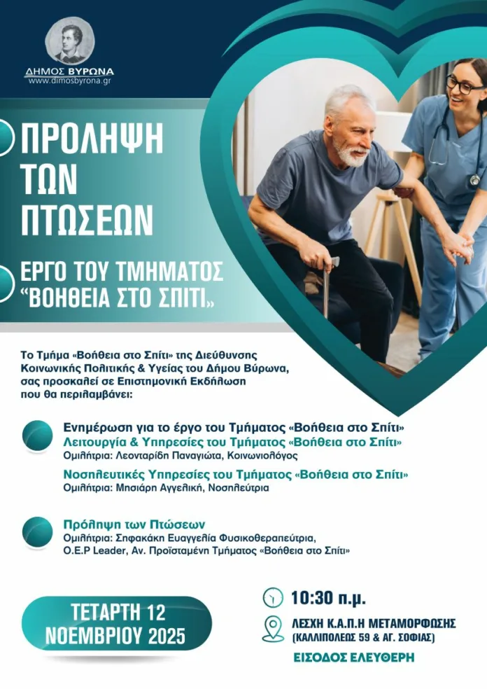 Ο Δήμος Βύρωνα, μέσω της Διεύθυνσης Κοινωνικής Πολιτικής και Υγείας και του τμήματος «Βοήθεια στο Σπίτι», διοργανώνει επιστημονική εκδήλωση αφιερωμένη στην πρόληψη των πτώσεων και στη φροντίδα των ηλικιωμένων. Η δράση θα πραγματοποιηθεί την Τετάρτη 12 Νοεμβρίου 2025, στις 10:30 π.μ., στο ΚΑΠΗ Μεταμόρφωσης του Δήμου.