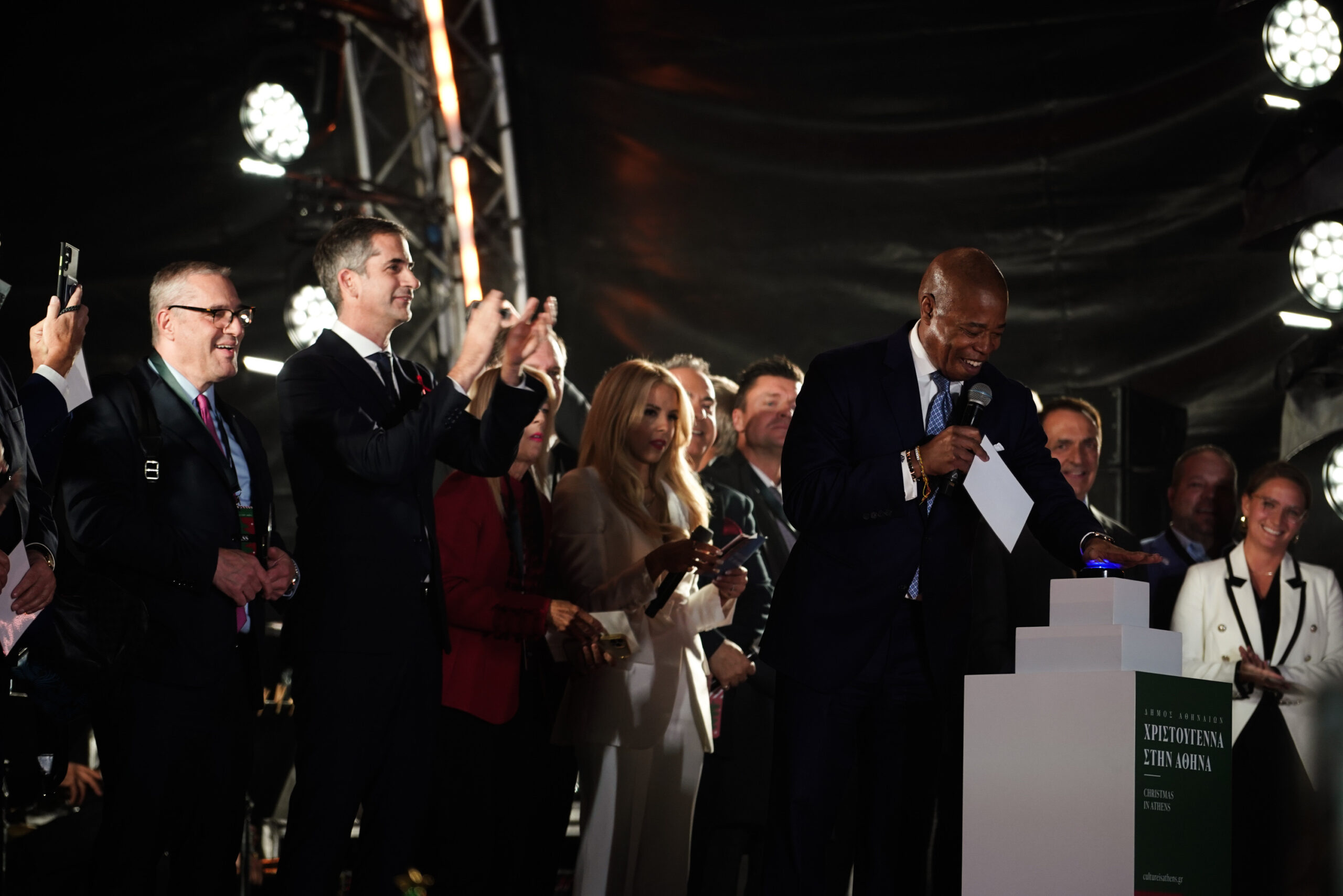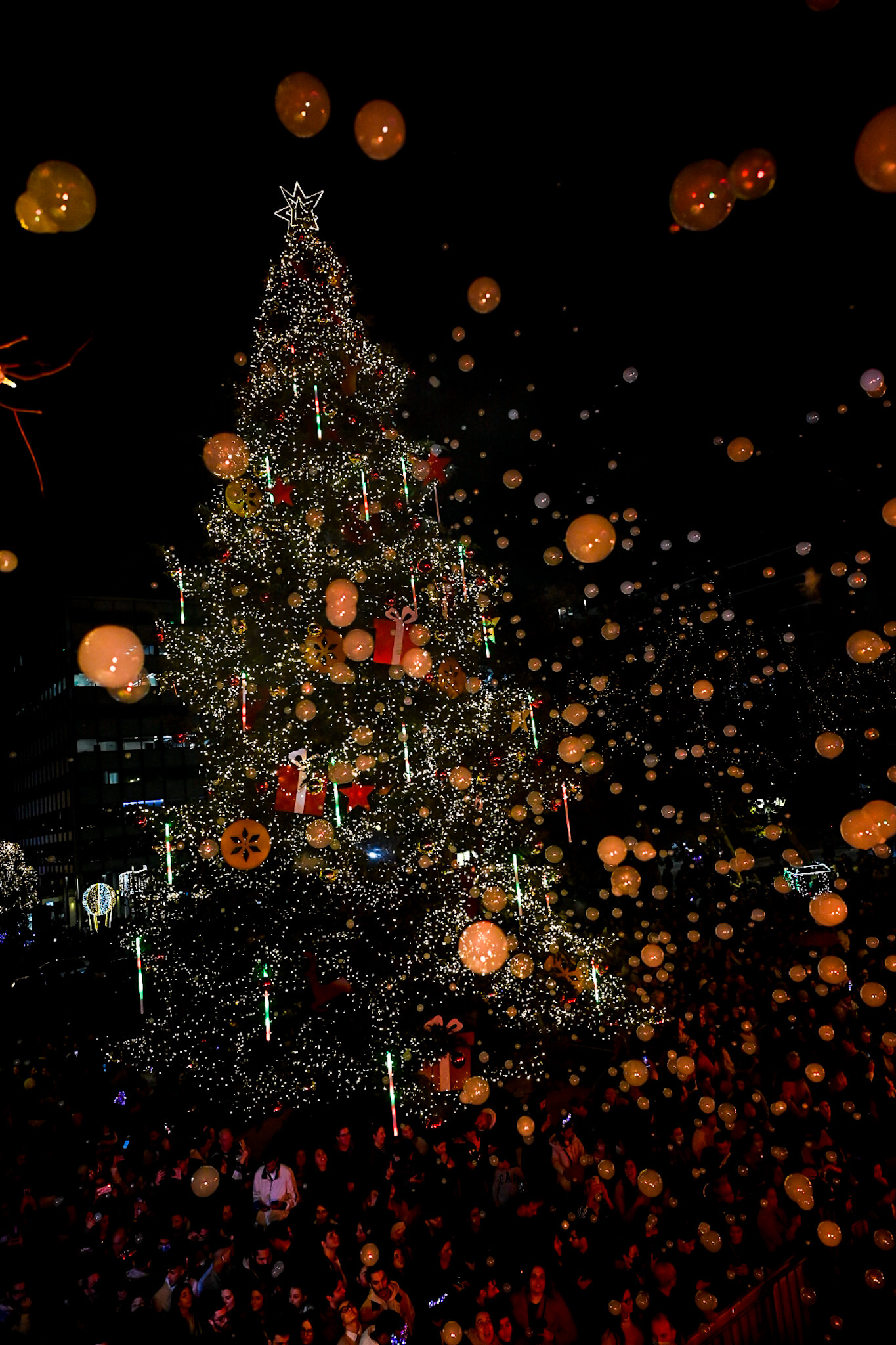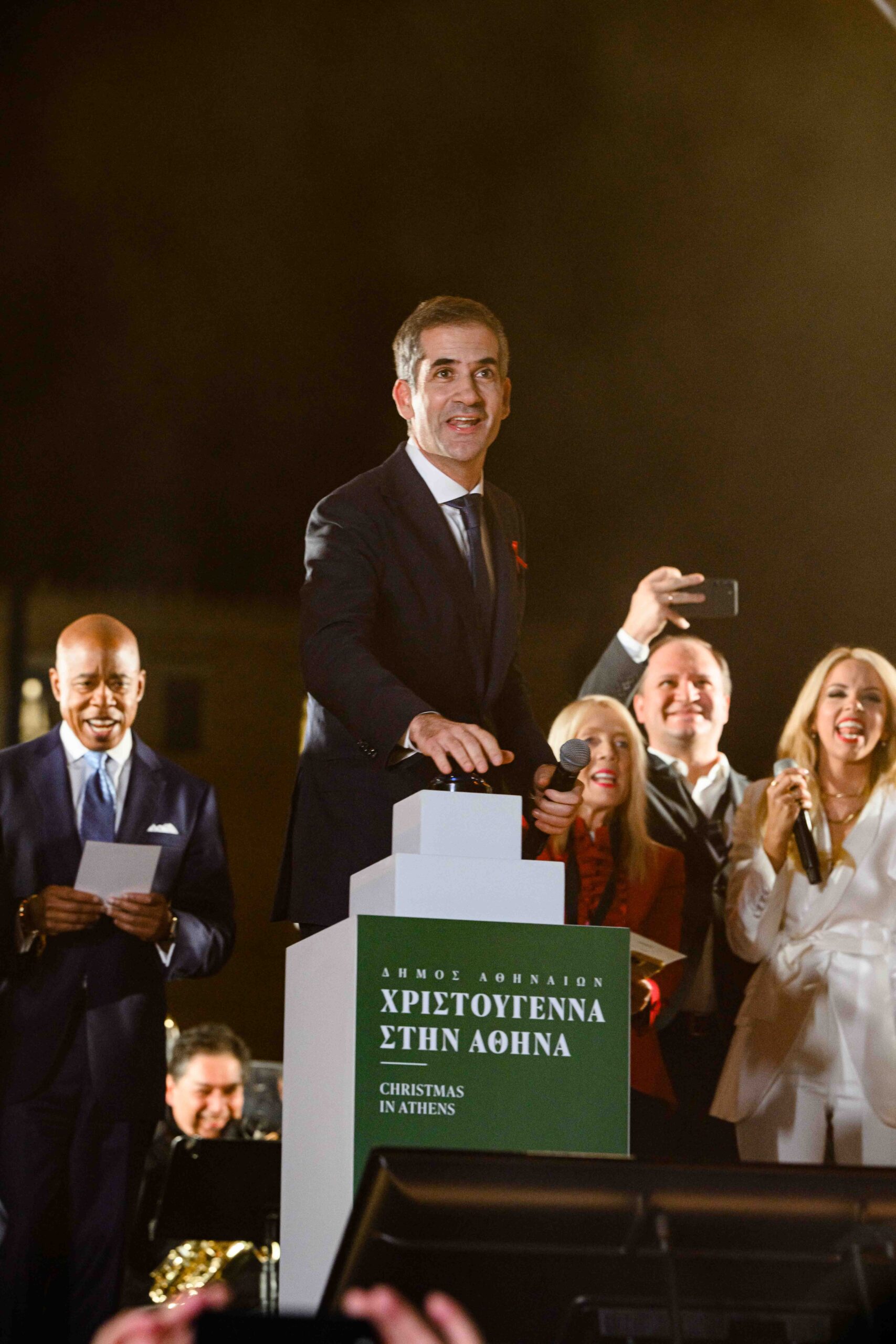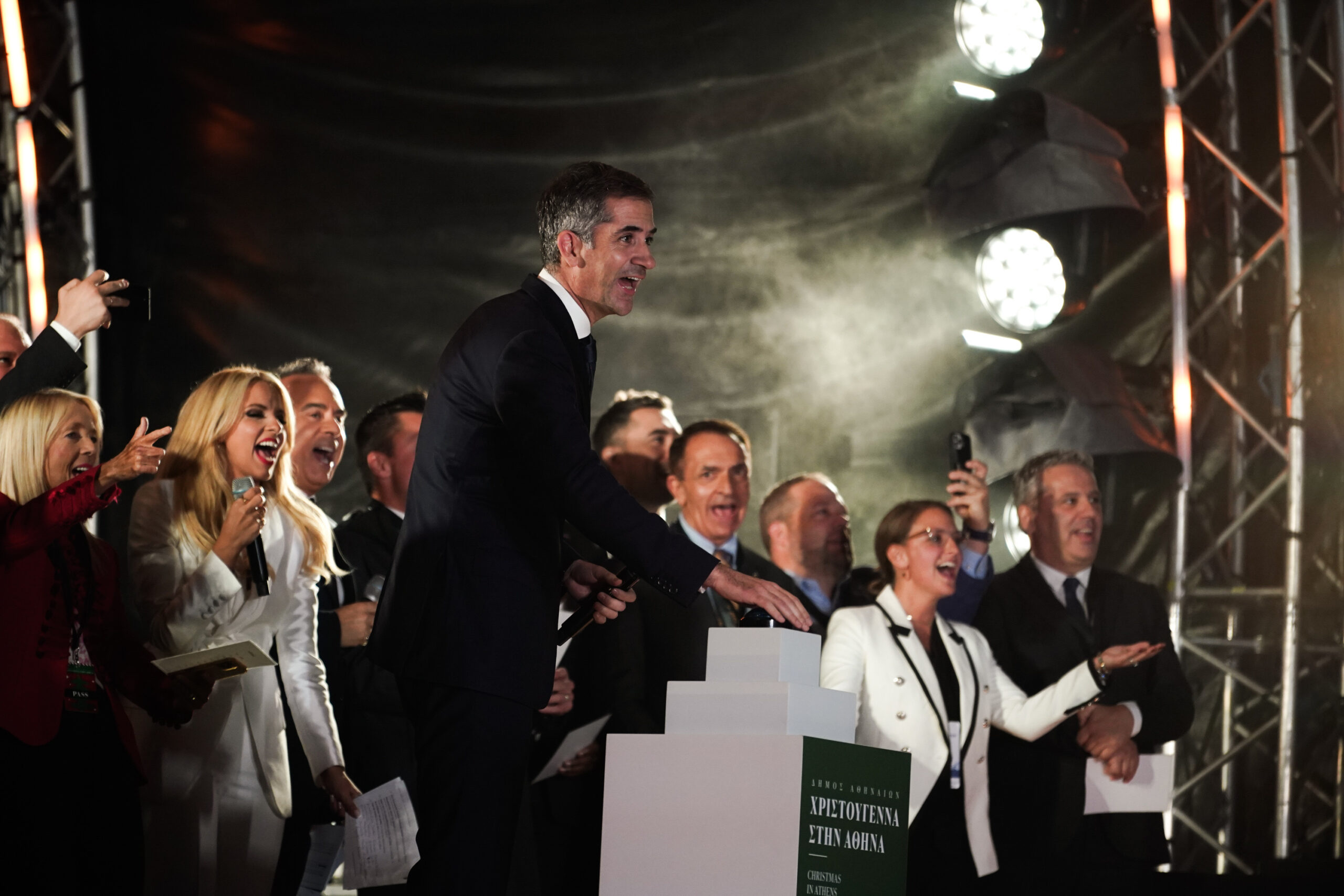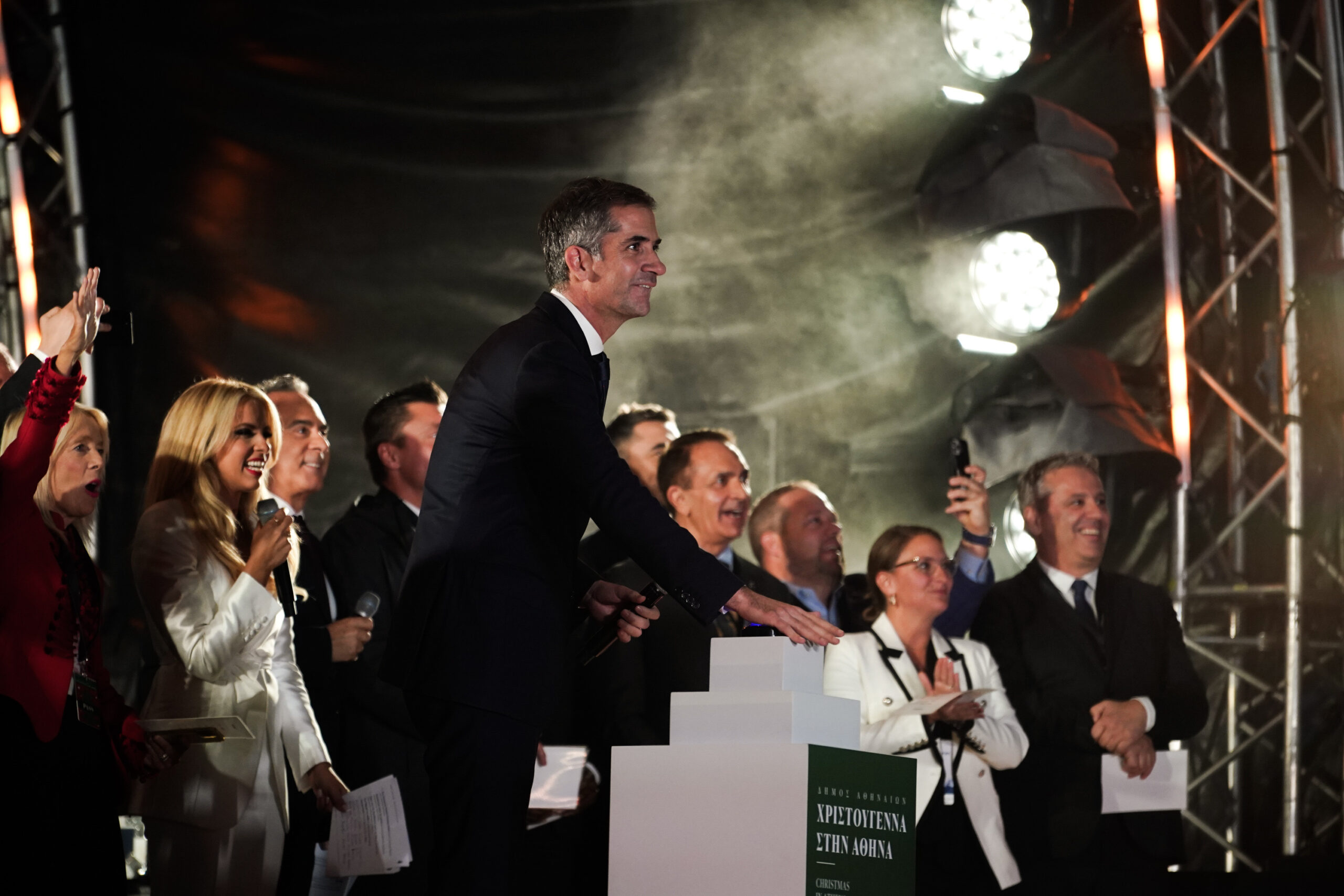 Ο δήμαρχος Αθηναίων, Κώστας Μπακογιάννης, καλωσόρισε στην κεντρική σκηνή που είχε στηθεί στην πλατεία Συντάγματος, τους δημάρχους από όλο τον κόσμο, που αυτές τις μέρες βρέθηκαν στην Αθήνα, και όλοι μαζί – μετά από αντίστροφη μέτρηση – φωταγώγησαν το μήκους 21 μέτρων έλατο, που δεσπόζει στην πλατεία.