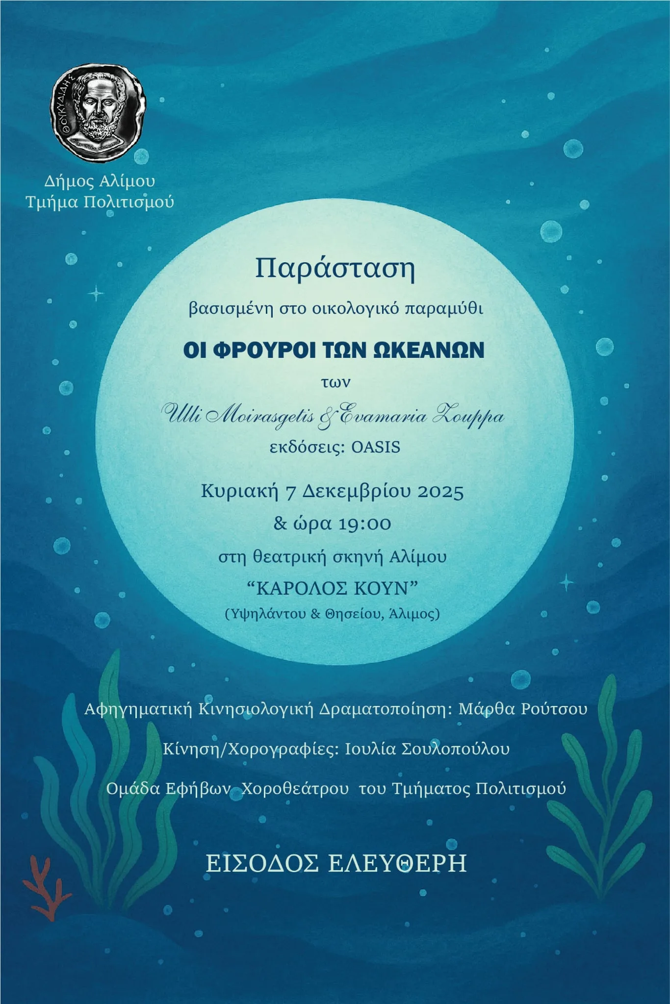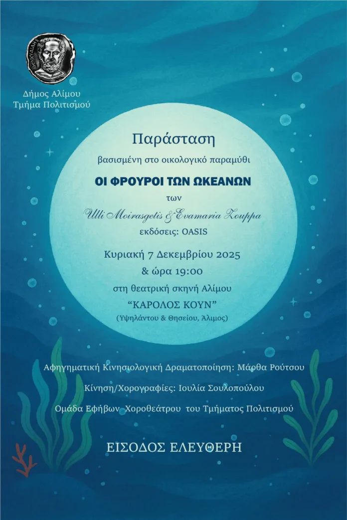 Την Κυριακή 7 Δεκεμβρίου, στις 7 το απόγευμα, η θεατρική σκηνή «Κάρολος Κουν» φιλοξενεί το εφηβικό χοροθέατρο του Τμήματος Πολιτισμού, το οποίο παρουσιάζει το οικολογικό παραμύθι «Οι Φρουροί των Ωκεανών», των Ulli Moirasgetis και Evamaria Luppa. Το έργο ανεβαίνει με σενάριο και σκηνοθεσία της Μάρθας Ρούτσου, ενώ τη χορογραφία επιμελείται η Ιουλία Σουλοπούλου.