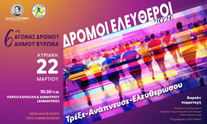 Σε διακοπή της κυκλοφορίας οχημάτων προχωρούν οι αρμόδιες αρχές στον Δήμο Βύρωνα την Κυριακή 22 Μαρτίου 2026, λόγω της διεξαγωγής του 6ου αγώνα δρόμου με τίτλο «Δρόμοι Ελεύθεροι».