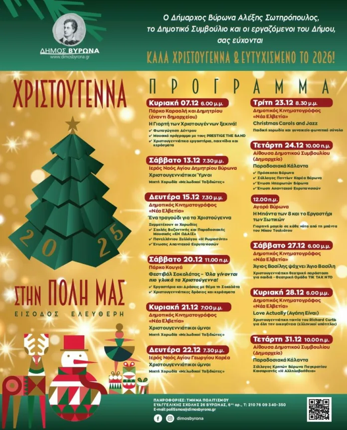 Ο Δήμος Βύρωνα υποδέχτηκε και φέτος τις γιορτές των Χριστουγέννων με ένα πλούσιο και ζωντανό πρόγραμμα εκδηλώσεων, γεμάτο μουσική, θέατρο, δημιουργικά εργαστήρια και παραδοσιακά έθιμα. Κατά τη διάρκεια των εορτών, από τις 7 έως τις 31 Δεκεμβρίου, μικροί και μεγάλοι γέμισαν τους χώρους της πόλης με χαρά και φως, συμμετέχοντας σε δράσεις ελεύθερης εισόδου που ανέδειξαν την παράδοση, τη δημιουργικότητα και τη συλλογικότητα.