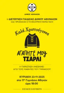 Παράλληλα, μαθητές Γυμνασίων συμμετέχουν στην παράσταση «Καλά Χριστούγεννα, Αγαπητέ μου Τσάρλι» της Σοφιάννας Θεοφάνους, ένα έργο για τη φιλία, την εφηβεία και τη σημασία της επικοινωνίας. Οι παραστάσεις θα δοθούν σε επτά Γυμνάσια της Αθήνας, επίσης σε διαφορετικές Δημοτικές Κοινότητες, με τη συμμετοχή μαθητών-ηθοποιών και συνοδεία ζωντανής μουσικής.