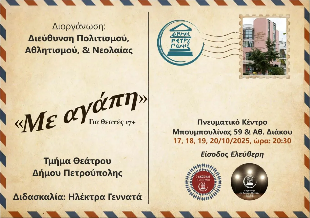 Από την Παρασκευή 17 έως και τη Δευτέρα 20 Οκτωβρίου 2025, στις 20:30, το Τμήμα Θεάτρου του Δήμου Πετρούπολης παρουσιάζει στο Πνευματικό Κέντρο (Μπουμπουλίνας 59 & Αθ. Διάκου) την παράσταση «Με αγάπη», κατάλληλη για θεατές άνω των 17 ετών.