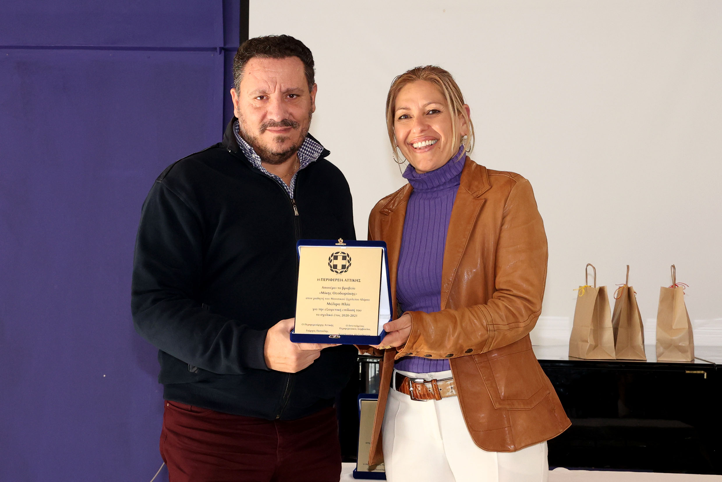 Τα βραβεία, που θα απονέμονται κάθε χρόνο στους πρωτεύσαντες μαθητές και μαθήτριες των τριών τάξεων του Λυκείου των Μουσικών και Καλλιτεχνικών Σχολείων της Αττικής, απονεμήθηκαν από τον Περιφερειάρχη Αττικής στους 3 μαθητές, των τριών τάξεων του Λυκείου του Μουσικού Σχολείου Αλίμου που αρίστευσαν κατά το σχολικό έτος 2020-21. Τα βραβεία συνοδεύτηκαν από χρηματικά έπαθλα, 400 ευρώ στον μαθητή της Ά Λυκείου, 500 ευρώ στον μαθητή της Β΄ Λυκείου και 600 ευρώ στον μαθητή της Γ΄Λυκείου αντίστοιχα.
