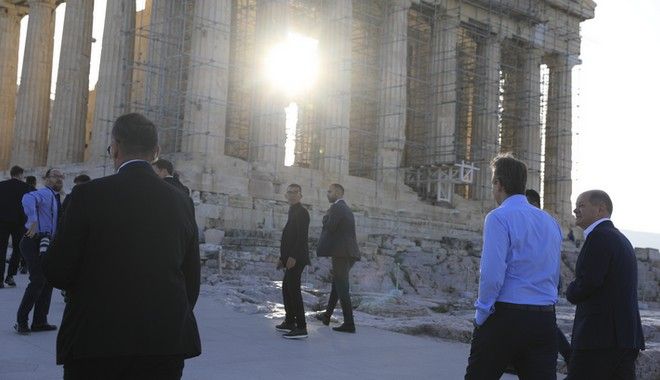 Το πρωί της Πέμπτης, λίγο πριν από τις 09:00, ο Γερμανός ηγέτης συναντήθηκε με τον Κυριάκο Μητσοτάκη, με τους δυο τους να μεταβαίνουν στον αρχαιολογικό χώρο της Ακρόπολης, όπου και ξεναγείται από τον Έλληνα πρωθυπουργό.
