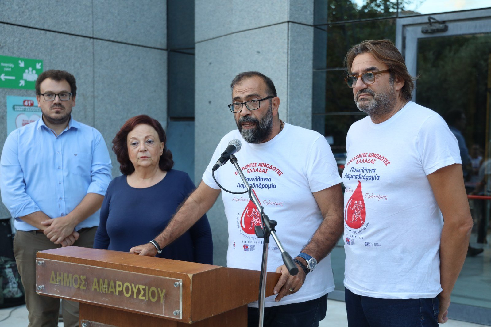 Στην είσοδο του Δημαρχείου η Αντιπρόεδρος της Πανελλήνιας Ομοσπονδίας Εθελοντών Αιμοδοτών Ελλάδας κα Αθηνά Εξάρχου, σε συνέχεια της λαμπαδηδρομίας από το Αιγάλεω, παρέδωσε τη Φλόγα της Αγάπης, που παρέλαβε εκ μέρους του Δημάρχου Αμαρουσίου κου Θεόδωρου Αμπατζόγλου, ο Πρόεδρος του ΟΚΟΙΠΑΔΑ κ. Πέτρος Κόνιαρης. Καλωσορίζοντας την 20η Λαμπαδηδρομία Εθελοντών Αιμοδοτών στο Μαρούσι ο κ. Κόνιαρης μεταξύ άλλων υπογράμμισε: